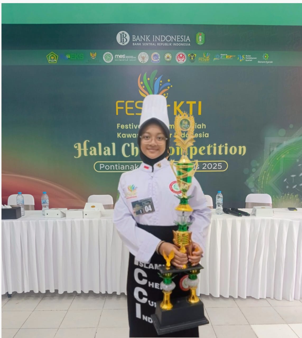 AL IZZAH SAMARINDA – 01 September 2025. Barakallah kepada Najma Ulya Al-Azka, siswa kelas 9 SMP Tahfidz Al-Izzah Samarinda, yang telah berhasil meraih juara 3 se-Indonesia Timur dan Tengah pada perlombaan Halal Chef Competition, KalaFest 2025 yang diadakan oleh Bank Indonesia pada tanggal 29 Agustus sampai dengan 1 September 2025 di Pontianak.